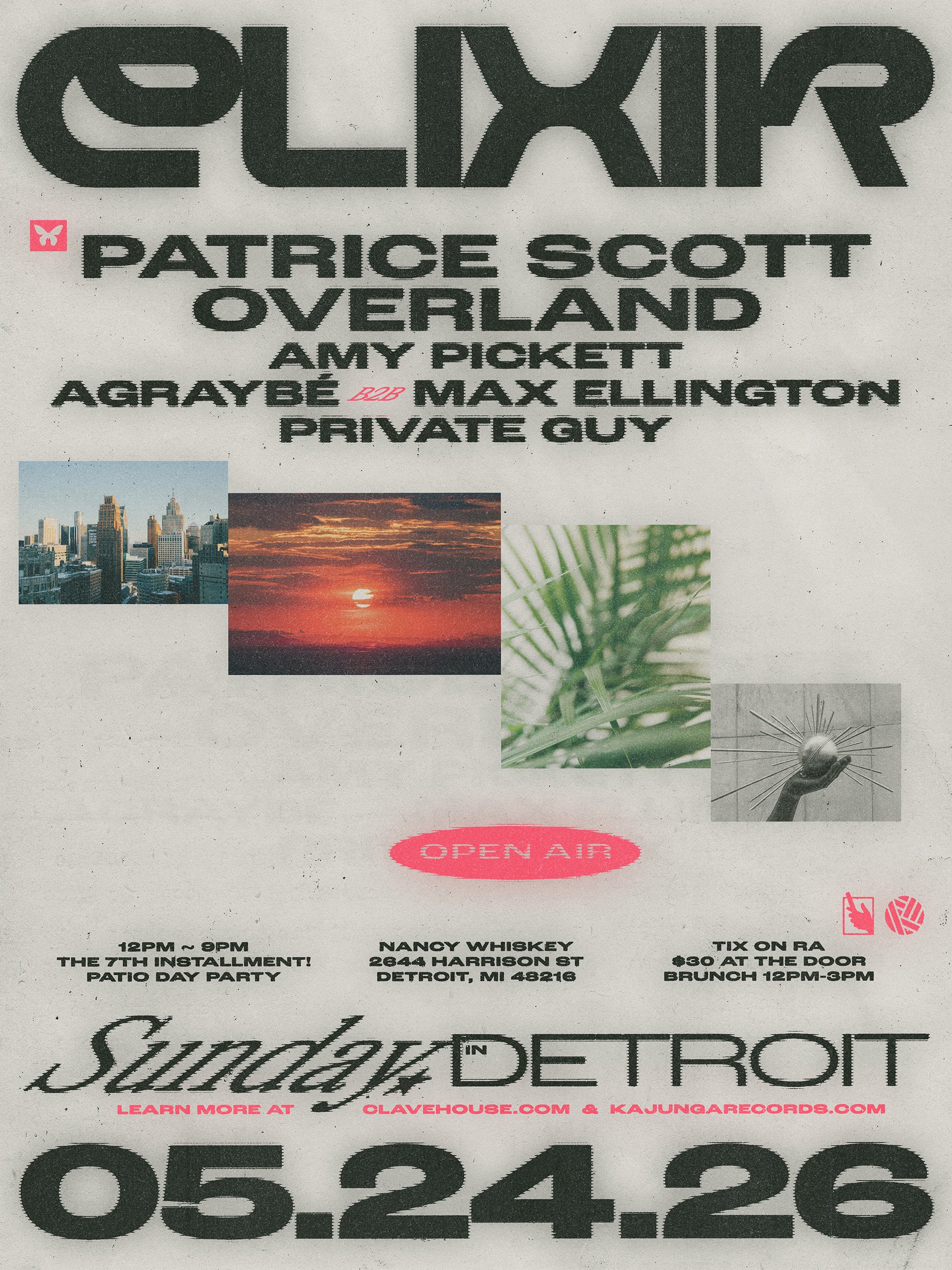 Elixir is back with the 7th installment, Sunday, May 24th in Detroit. 🌿 Day party on a patio! (Noon~9pm) Featuring the sounds of Patrice Scott, Overland, Amy Pickett, Agraybé b2b Max Ellington and Private Guy. Tickets on RA now!